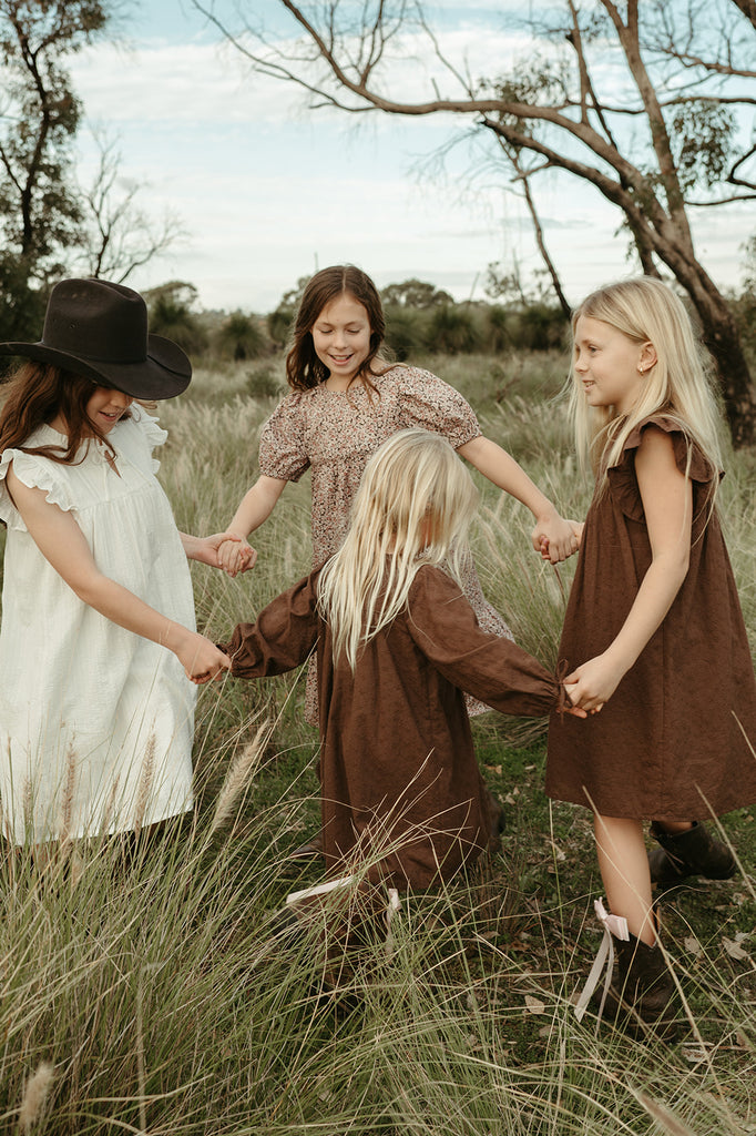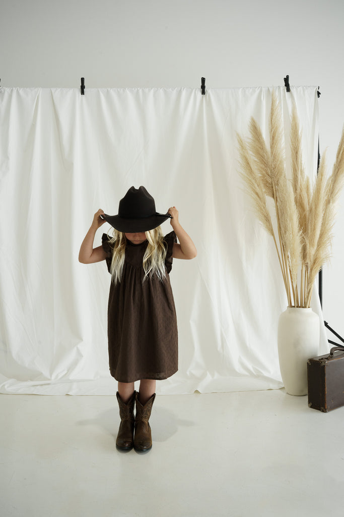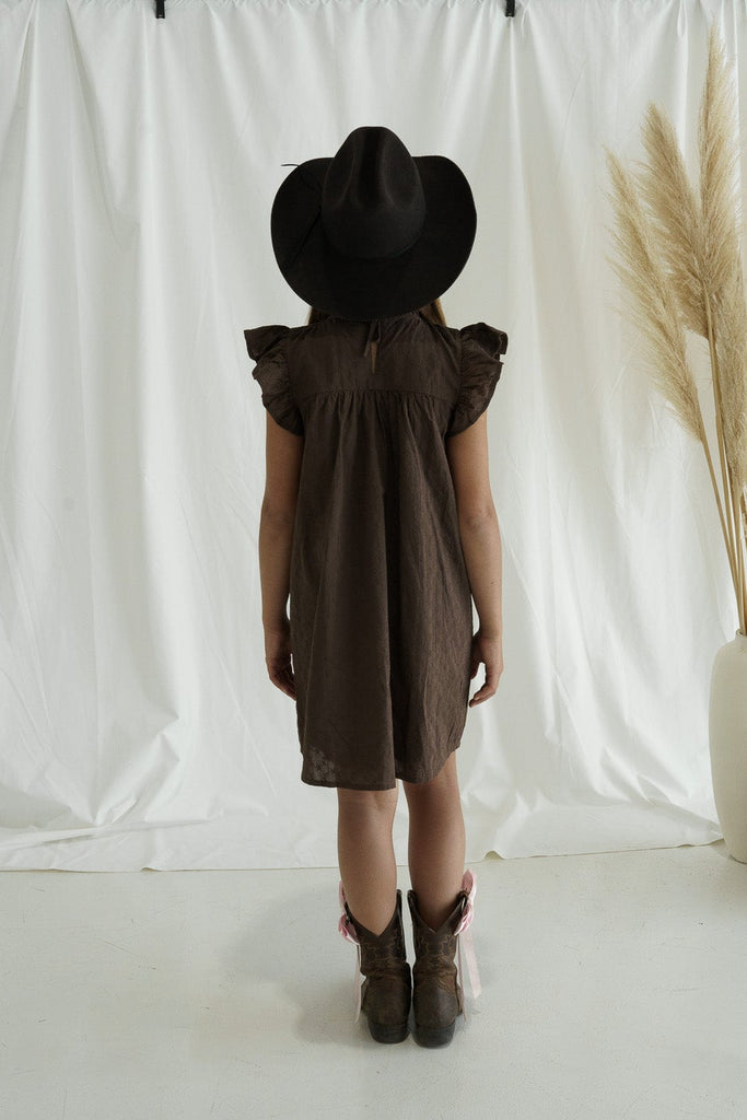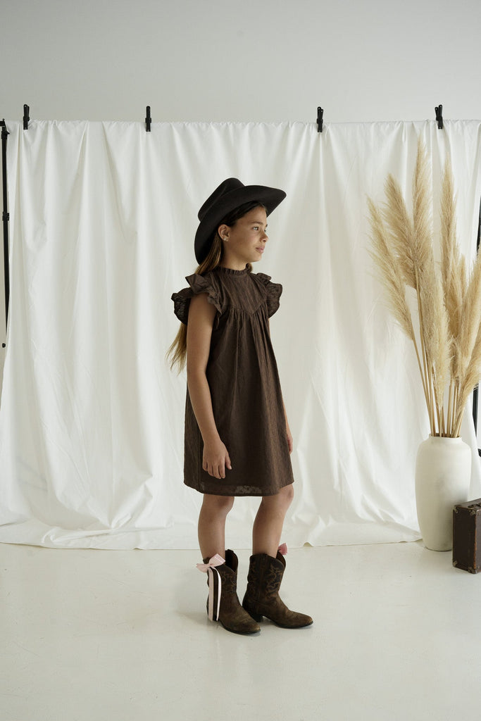 Crafted from delicately embroidered cotton, the Evie Sleeveless Dress features soft ruffle sleeves and a refined V yoke panel, offering a timeless silhouette with a modern edge.